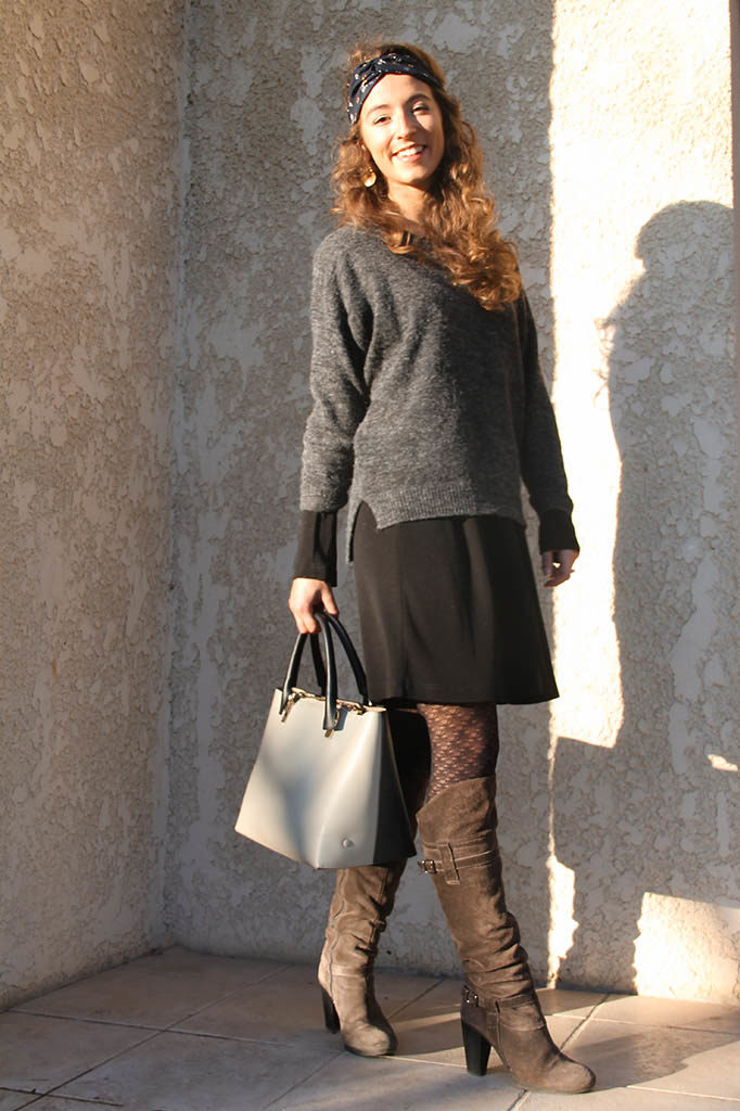 Sous un pull un peu large, la robe fluide se transforme en robe-pull. Elle épouse parfaitement le retombé lâche du pull pour un effet décontracté. Les accessoires permettent alors de donner un peu d’allure à la tenue : un headband fleuri (à retrouver dans ce look), des boucles d’oreille pendantes (à retrouver ici) et des bottes à talons.